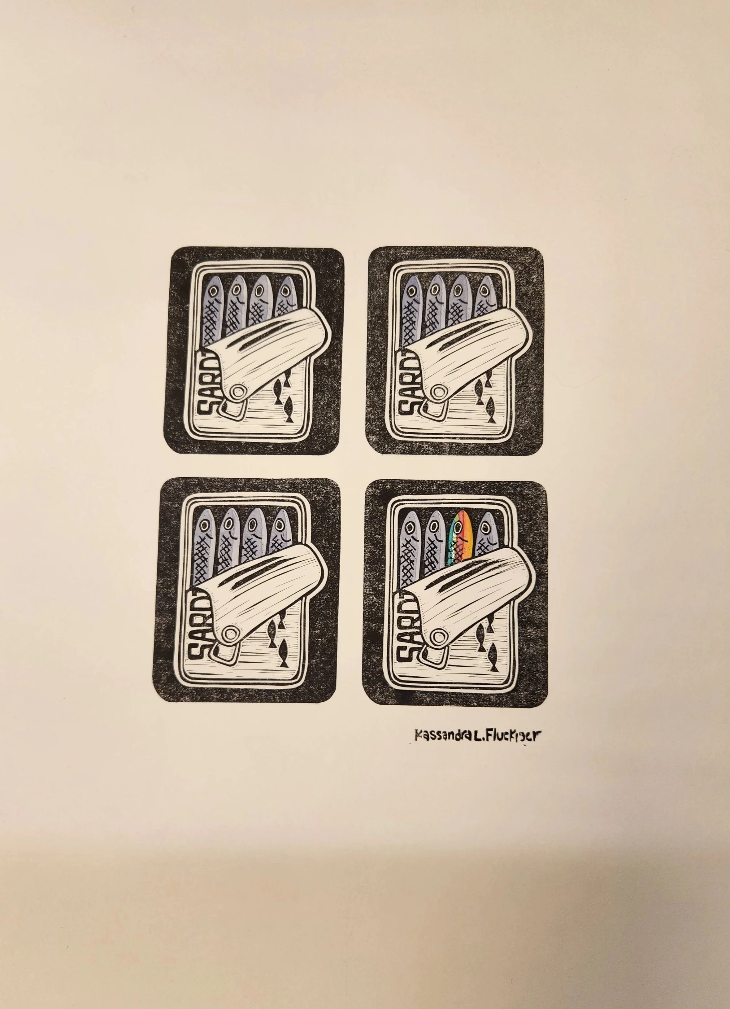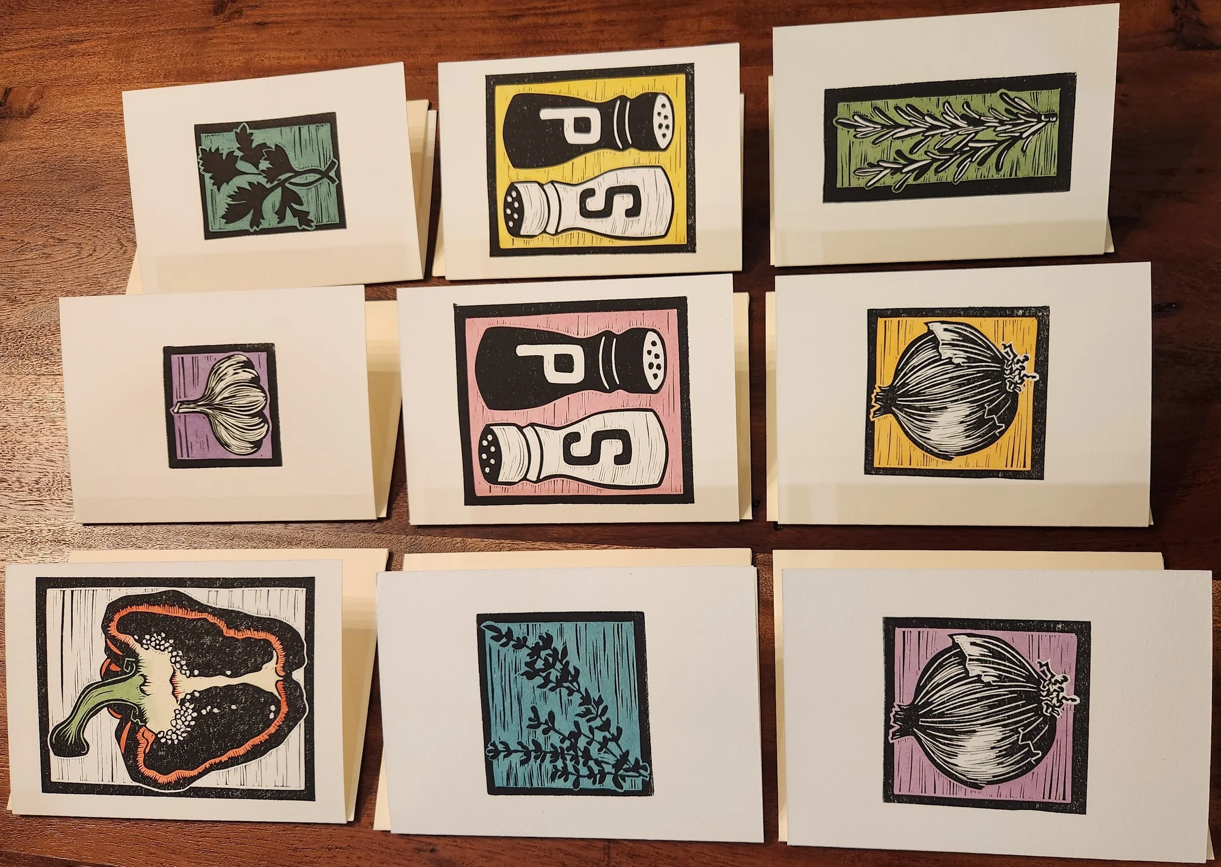 A rotating selection of blocks are inked and watercolored onto greeting cards and sold at local boutiques.